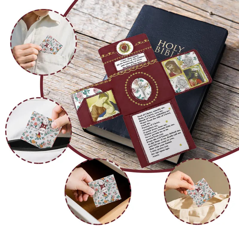 This handmade Catholic prayer pocket is more than a decoration—it’s a small, sacred companion for daily devotion. Carefully sewn from vintage-inspired fabric, it holds a Sacred Heart crucifix, a Virgin Mary medal, and a printed prayer card for moments of spiritual communion. Keep it by your bedside, on your home altar, or tuck it into your bag as a travel blessing wherever you go.