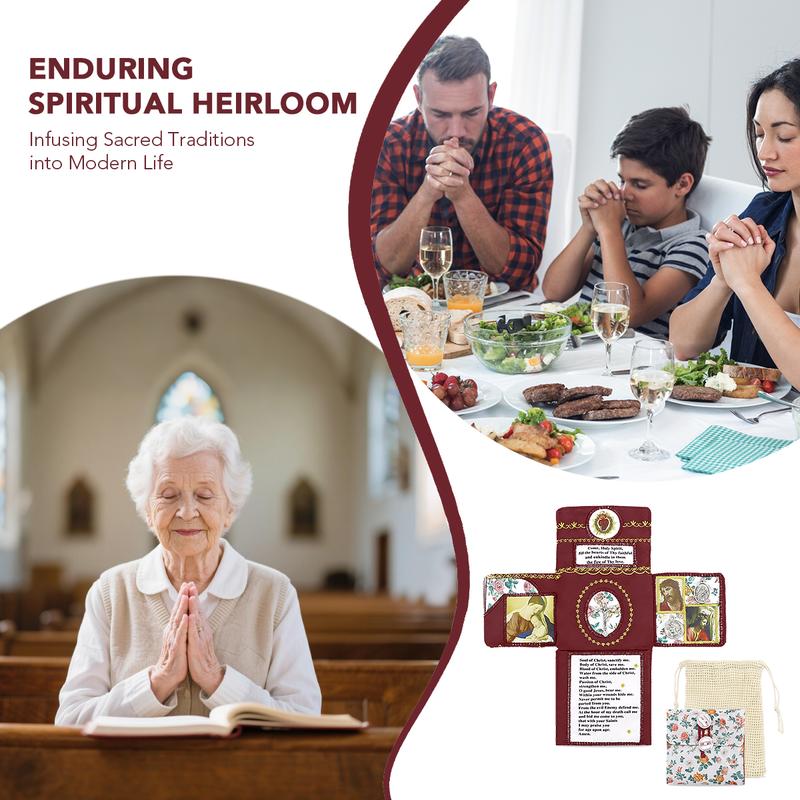 Handmade Catholic Prayer Pocket – Sacred Heart & Virgin Mary Crucifix with Prayer Card, Vintage Fabric Travel Blessing Bag for Home Altar, Hospital Visits, Mom & Grandma Gift, Drawstring Sack